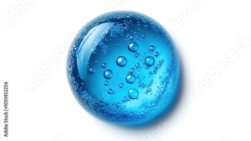 A shimmering blue sphere capturing tiny bubbles in tranquil elegance against a white background