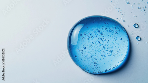 A shimmering blue sphere capturing tiny bubbles in tranquil elegance against a white background
