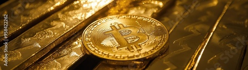 A shining Bitcoin coin rests on a bed of gold bars, symbolizing wealth and investment in cryptocurrency.