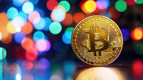 A shiny Bitcoin coin stands out against a colorful, blurred background of lights, symbolizing cryptocurrency and digital finance.