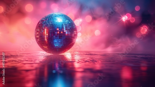 A shiny disco ball sits on a reflective surface, surrounded by colorful lights and a hazy atmosphere.