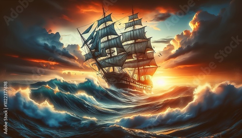 vibrant, sunset, ocean, adventure, ship, wave, dramatic, travel, nature, beauty, seascape, sailing, journey, horizon, skyline, cloud, sunlight, marin, nautical, exploration, water, scenic, high-coloured, tranquil, wilderness, freedom, historic