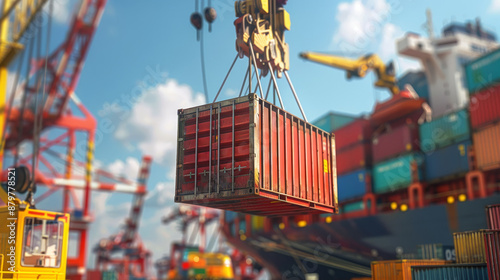 shipping, container, lift, crane, tied-up, port, surround, various, industrial, equipment, men at work, handle, shipment, dropped, export, gantry, transit, landscape, marin, supply, chain, logistic, heavy, harbor, vessel, transport, import, storage, commerce, freighter