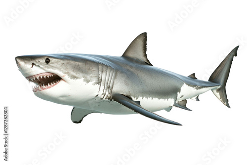A side view of a large shark with sharp teeth against a transparent background showcasing detail of the aquatic predator
