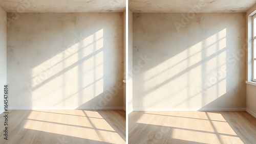 A side-by-side comparison of empty rooms showcasing different wall textures in ambient light.