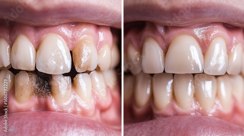 A side-by-side view of a person's mouth with gaps and missing teeth, then with a full on blurred background