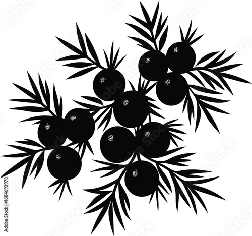 A silhouette illustration of a black currant branch with ripe berries and detailed leavesA silhouette illustration of a black currant branch with ripe berries and detailed leaves