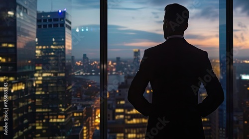 A silhouette of a businessman gazing at a stunning city skyline during twilight, showcasing ambition and tranquility.