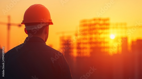 A silhouette of a construction worker in a hard hat gazes at a sunset behind a building site, symbolizing hard work and perseverance.