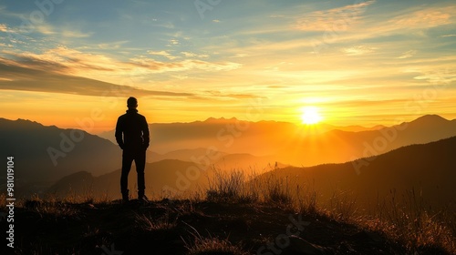 A silhouette of a man standing on a hilltop, watching the sunrise.