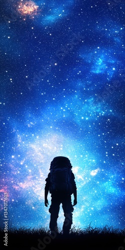 A silhouette of a person with a backpack gazes at a vibrant starry sky filled with galaxies and cosmic colors.
