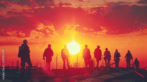 A silhouette of an engineer and construction workers working in the light flare of a pastel sunset, signifying dedication at Construction site