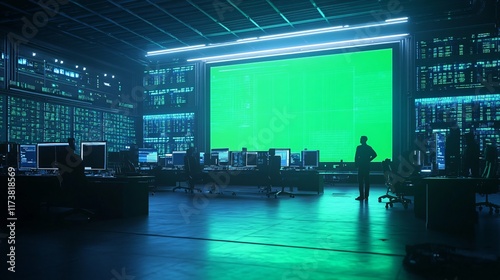 A silhouette of an individual stands in a high-tech control room filled with computer screens and neon lights.