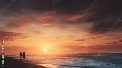 couple, sunset, beach, romantic, ocean, nature, sea, wave, sand, shore, coast, water, sky, cloud, evening, dusk, twilight, horizon, silhouette, people, man, woman, human relationships, love, romance, journey, walk, strolling, freedom, peace, tranquil, serene, calm, together, beauty, natural, scenic, landscape, travel, vacation, holiday, leisure, relaxation, warm, light, gold, orange, atmospheric