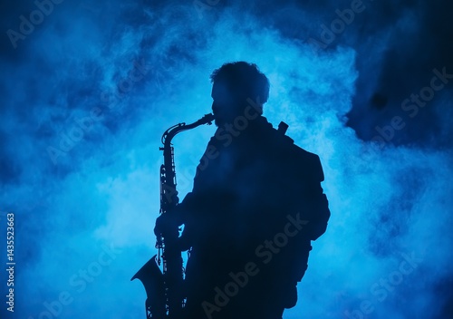 A silhouetted figure of a saxophone player in the dark, with the instrument's outline visible against a blue background filled with smoke and fog.