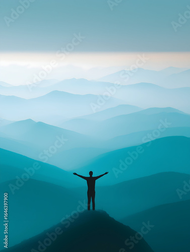 A silhouetted figure stands atop a mountain, arms outstretched, overlooking vast, misty blue hills under a serene sky.