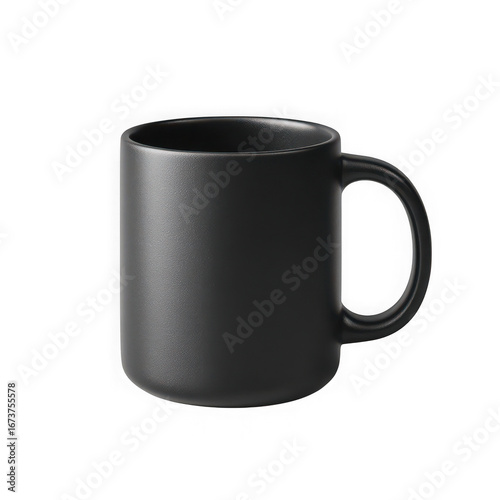 A simple black ceramic coffee mug with a handle showcasing a minimalist design isolated on transparent background