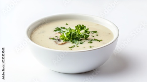 simple, bowl, creamy, mushroom, soup, served, plain, white, ceramic, light, sprinkle, fresh, herb, top, centered, soft, ambient, lighting, creating, warm, inviting, atmosphere, clean, additional, element