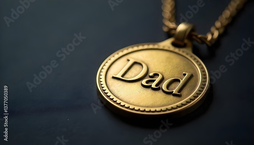 A simple gold medal with ‘Dad’ engraved on it, placed on a dark background with soft lighting, perfect for father's day