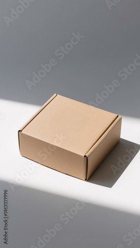 A simple, single, closed, cardboard box, illuminated by sunlight. It's a clean, isolated image that emphasizes the shape, form and texture of the object, with shadows providing depth
