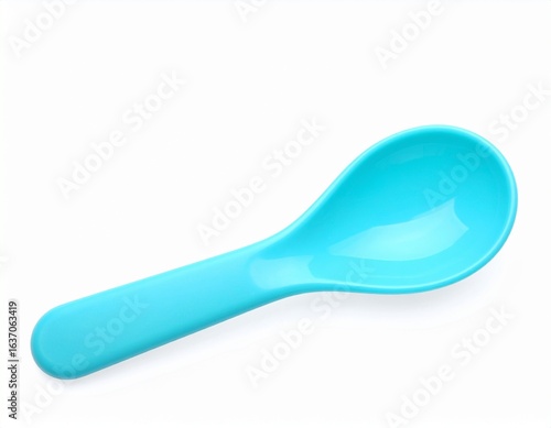 A simple turquoise plastic baby spoon isolated on a white background, perfect for food and dining concepts.