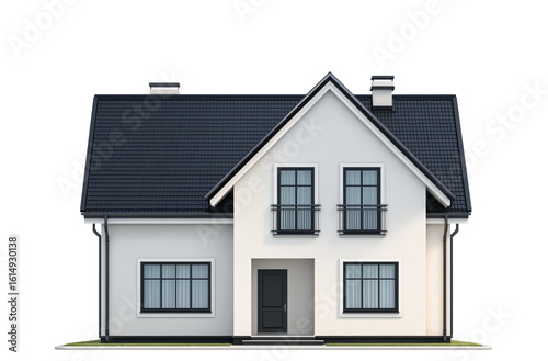 A simple two-story house with black windows, white walls, and a gray roof. The front of the building is decorated with small bushes on both sides.