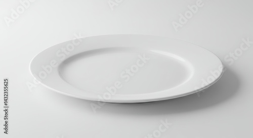 A simple white ceramic plate centered on a white background with soft lighting and minimal shadows