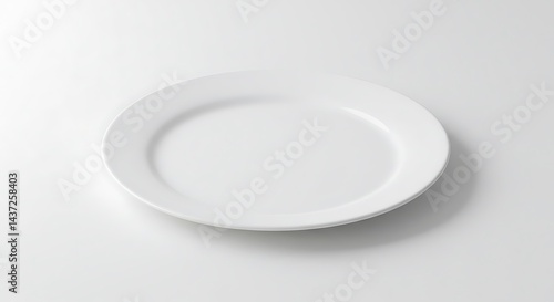 A simple white plate centered on a white surface casting a subtle shadow in a well lit environment