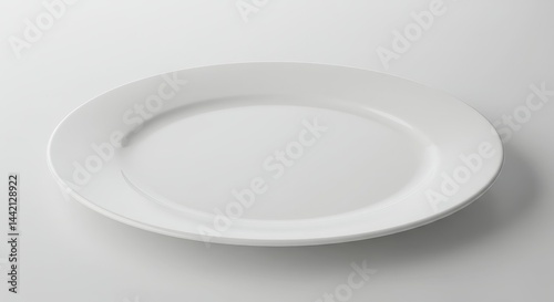 A simple white plate on a white background showcasing a minimalist and clean presentation style dishware