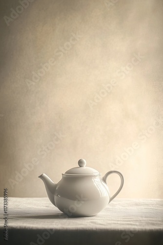 A simple white porcelain teapot sits on a table against a neutral background, showcasing minimalist elegance and soft lighting.