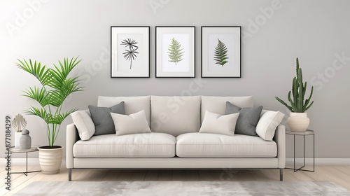 simple, elegant, living, room, setting, soft, beige, wall, ivory, sofa, grey, pillow, space, adorned, plant, vase, side, table, creating, fresh, atmosphere, gallery, wall, framed, picture, information technology, adding, character, decor, photorealistic, rendering, sharpened, natural, light, shadow, depth, style