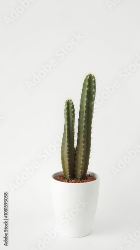 A single cactus plant in a white vase, set against a clean white background, prickly, cactus