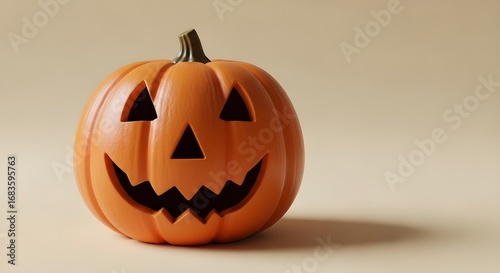 A single, carved orange halloween jackolantern with a smiling face, isolated on a plain, neutral background with soft lighting and a subtle shadow