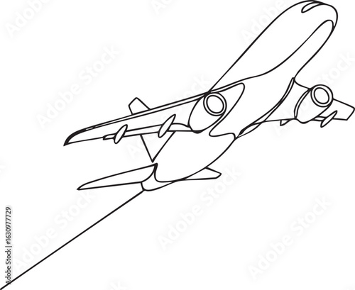 A single continuous line drawing of a passenger airplane taking off.
