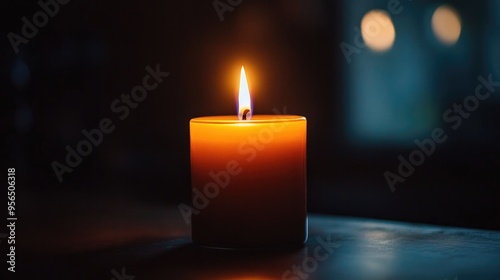 A single flame flickering on a candle in the dark, casting a warm and intimate glow