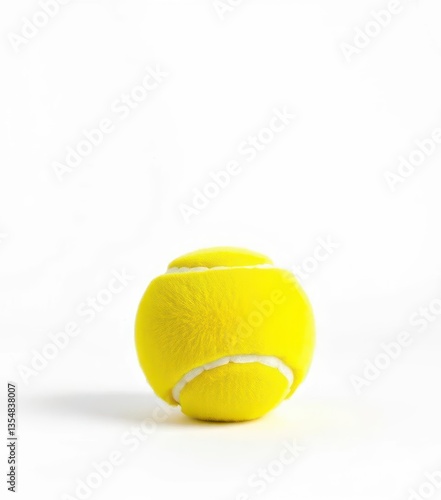A single, fuzzy yellow tennis ball against a pure white backdrop, close-up, tennis ball