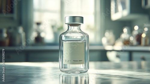 A single glass vial with a blank label sits on a countertop in a laboratory setting.
