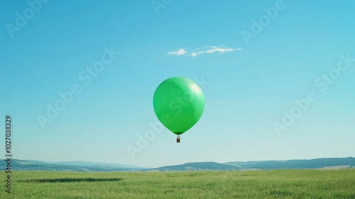 A single green balloon against the backdrop of scenic fields and a clear blue sky. No people.
