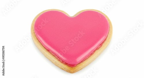 A single heart-shaped cookie with bright pink icing, perfectly centered on a plain white background, conveying a message of love or sweetness