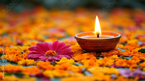 A single lit candle rests on a bed of colorful flower petals, symbolizing peace and tranquility.