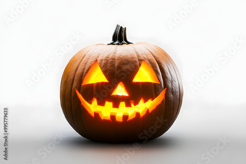 A single lit spooky halloween pumpkins, Jack O Lantern with evil face and eyes isolated against a transparent background.