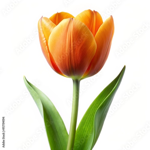 A Single Orange Tulip on White Background, Photograph, Flower, Petal, Green, Tulip, Spring
