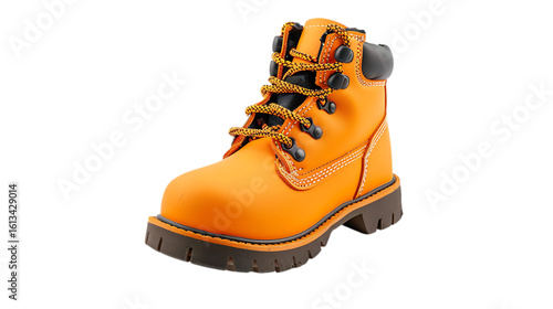 footwear, work boot, orange, sole, boot, leather, fashion, style, outdoors, protective, construction, safety, equipment, rugged, hard-wearing, gear, isolated, single, studio, view, lace, eyelet, brown, yellow, cord, textile, clothing, apparel, industrial, uniform, heavy duty, workwear, workplace, professional, robust, sturdy, traction, ground, tread, grip, secure, work
