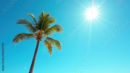 A single palm tree silhouetted against a vibrant azure sky, bathed in the radiant glow of a summer sun, evokes feelings of tranquility and tropical escape.