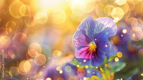 A Single Pansy Flower with Golden Bokeh Background
