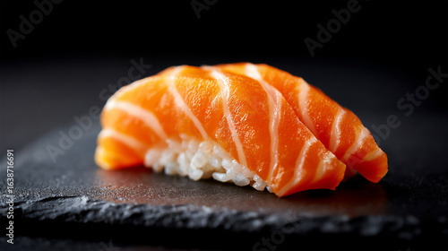 A single piece of salmon nigiri sushi, perfect texture wth black background