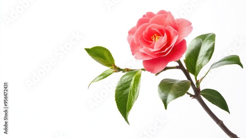photo, camelia, flower, pink, blossom, bloom, flower petals, leaf, green, floral, nature, spring, summer, beauty, delicate, romantic, garden, botanical, white background, isolated, macro, closeup, vibrant, bright, soft