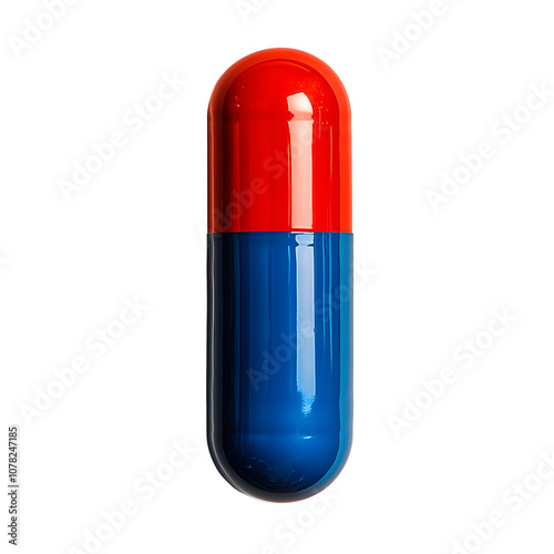 A single red and blue capsule isolated on a transparent background, with a glossy finish and a slight shadow.