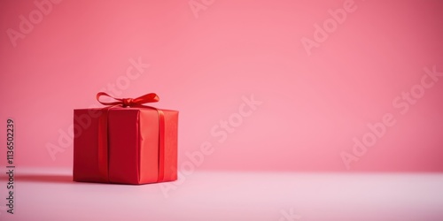 A single red gift box with a red ribbon bow sits on a pink surface against a pink background