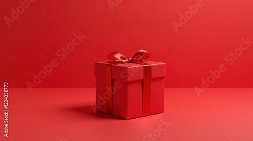A single red gift box with a satin ribbon bow sits on a red surface against a matching backdrop